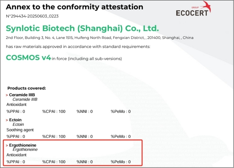 Shanghai Yunluo: Ergothione získal certifikaci COSMOS