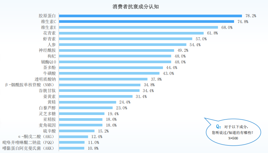 Díky osvětě a rozvoji trhu je kolagen v současnosti mezi spotřebiteli vysoce uznávanou „složkou proti stárnutí“. V průzkumu o porozumění běžným složkám proti stárnutí jsou kolagen (78,2 %), vitamin C (74,8 %) a vitamin E (68 %) třemi hlavními složkami, které spotřebitelé uznávají u orálních produktů proti stárnutí. Mezi 5 nejlepšími vnímanými složkami proti stárnutí v různých věkových skupinách je kolagen nepochybně „hvězdnou složkou“.